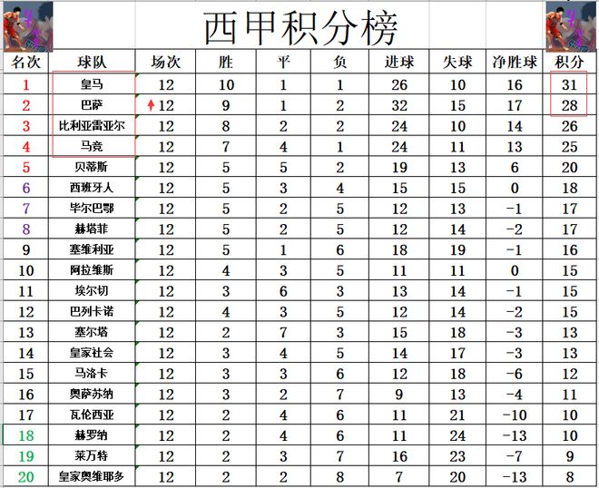 積分榜方面,皇馬爆冷被弱旅逼平,4連勝被終止,不過他們還有領先優勢。巴薩擊敗塞爾塔后,再次超過比利亞雷亞爾2分重回前2,同時將和皇馬的差距縮小到3分。馬競近段時間也是連勝不斷,他們差皇馬6分排在第4。